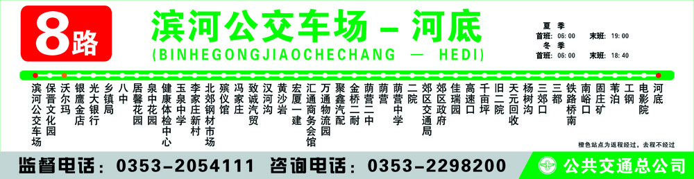 濱河公交車場(chǎng) - 保晉文化園 - 銀鷹金店 – 光大銀行 - 鄉(xiāng)鎮(zhèn)局 - 八中 - 居馨花園 - 泉中 花園 - 健康體檢中心 - 玉泉中學(xué) - 李家莊新村 - 北 郊鋼材市場(chǎng) – 殯儀館 - 馮家莊 - 致誠(chéng)汽貿(mào) - 漢河溝 - 黃沙巖 - 匯通商務(wù)會(huì)館- 萬(wàn)通物流園 - 聚鑫汽配 - 金橋二耐 - 蔭營(yíng)二中 - 蔭營(yíng) - 蔭營(yíng)中學(xué)- 二院 - 郊區(qū)交通運(yùn)輸局 - 郊區(qū)政府 - 佳瑞園 - 高速口 - 千畝坪 - 舊二院 - 天元回收 - 楊樹溝 - 三郊口 - 三都 - 鐵路橋南 - 南峪口 - 固 莊礦東大門 - 葦泊 - 工鋼 – 河底中學(xué) – 融浦小區(qū) - 河底